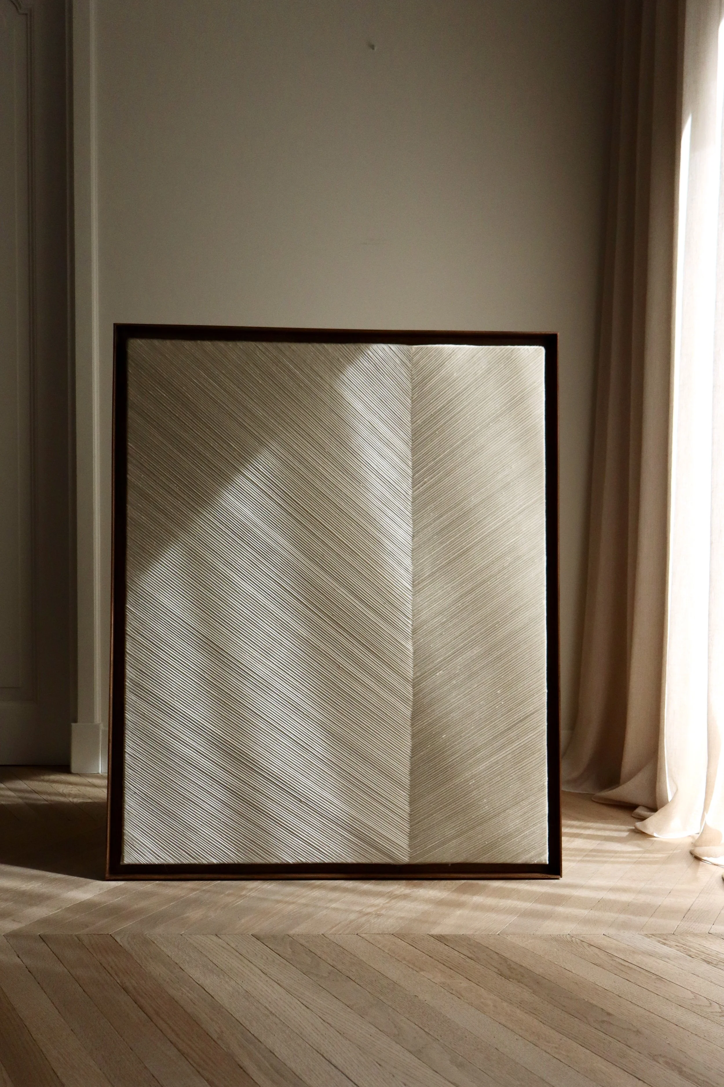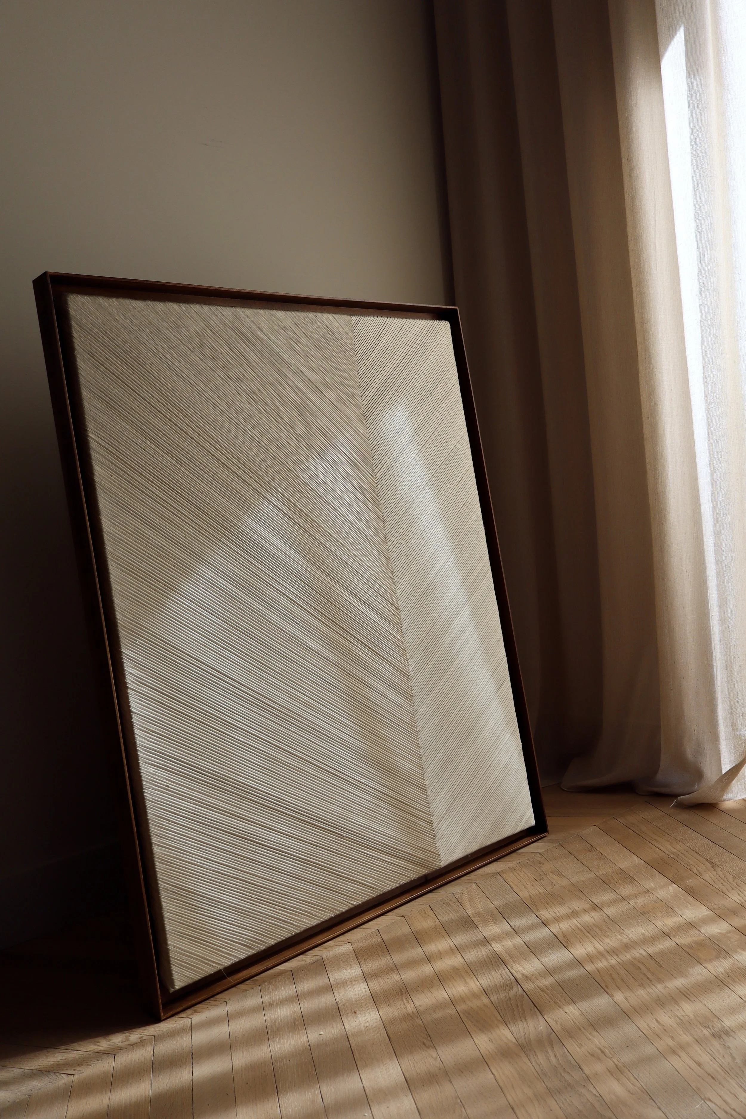 Crafted from raw silk, including a dark linden wood floating frame.