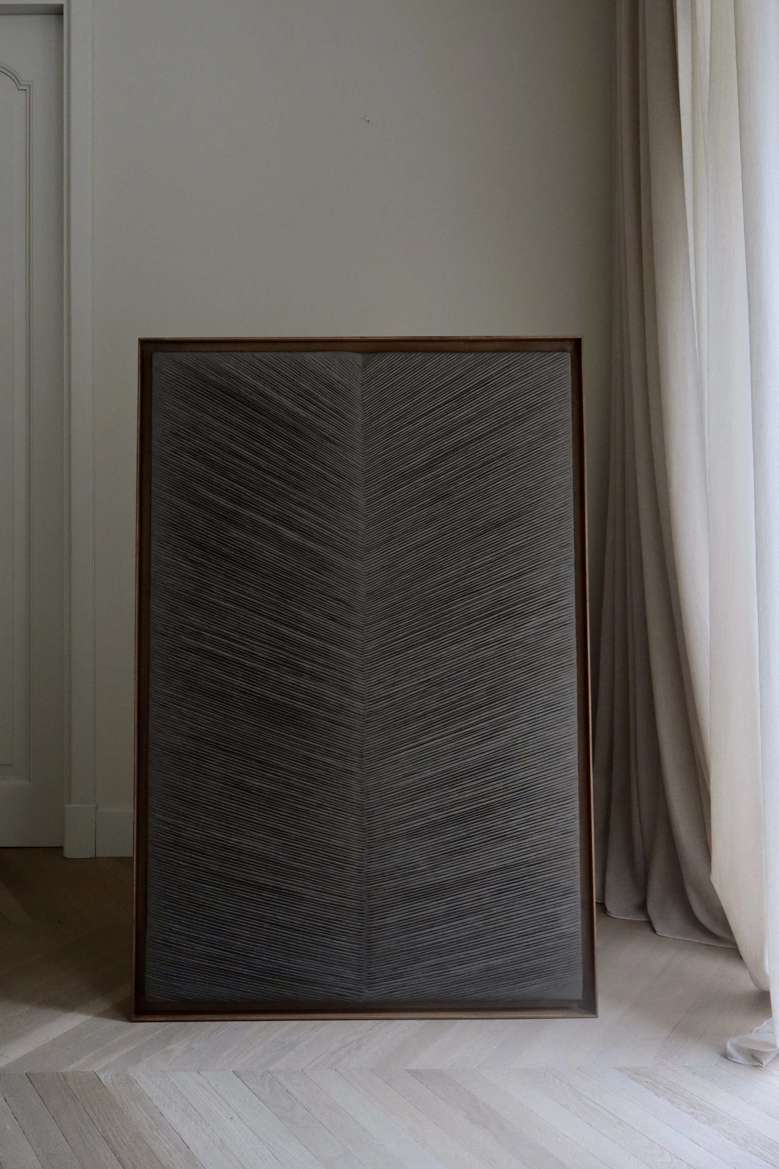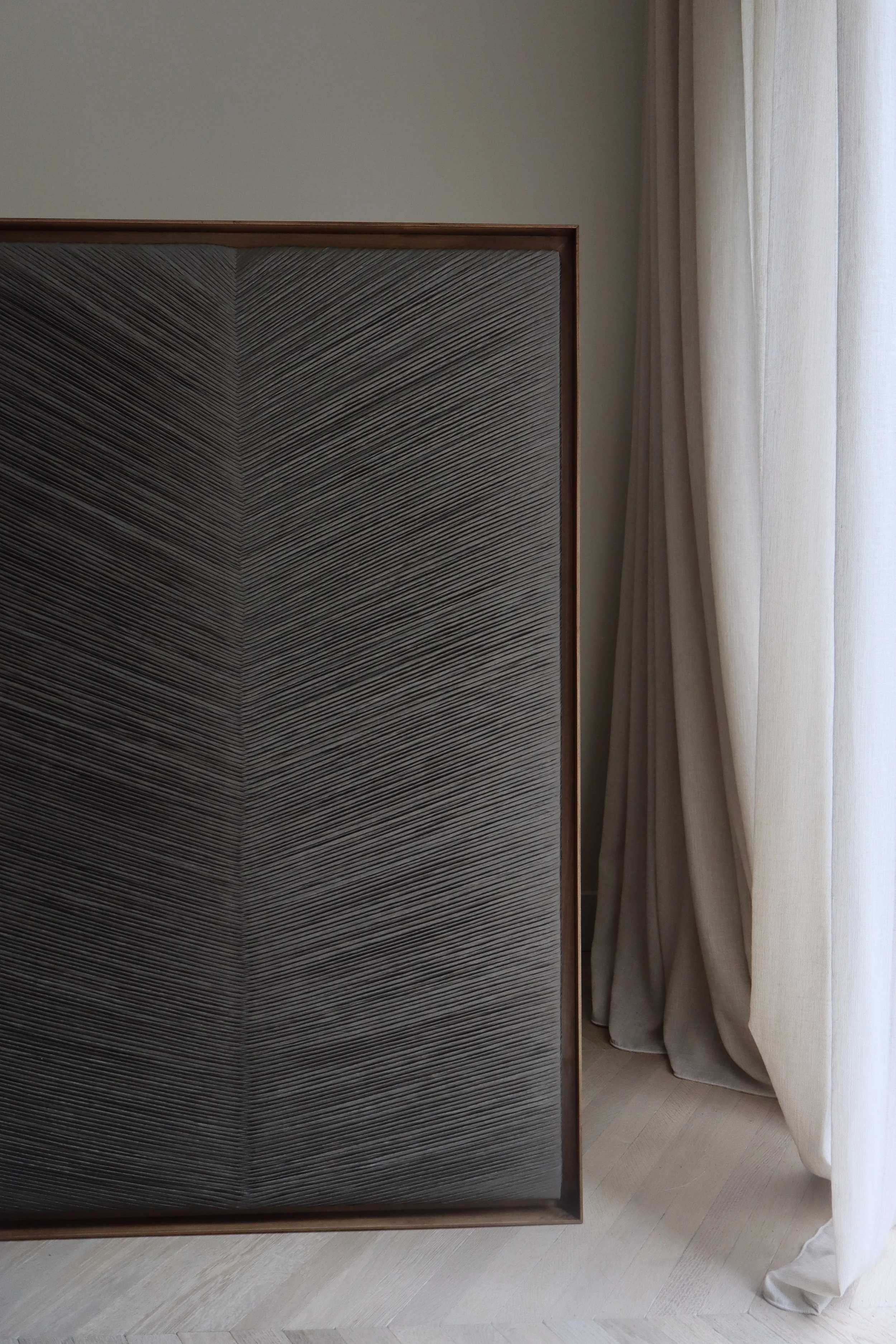Crafted from a raw silk-like fabric, including a dark linden wood floating frame.