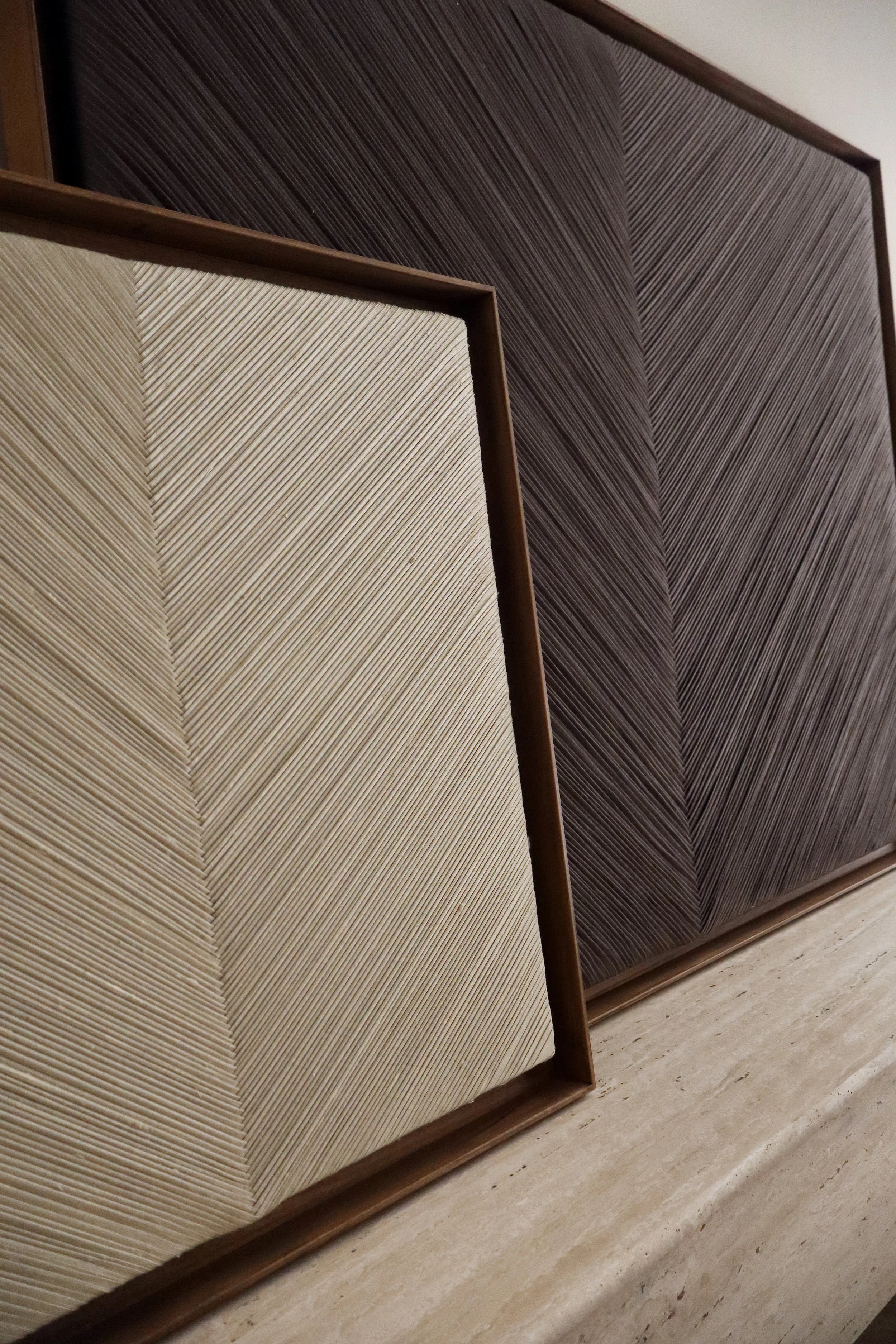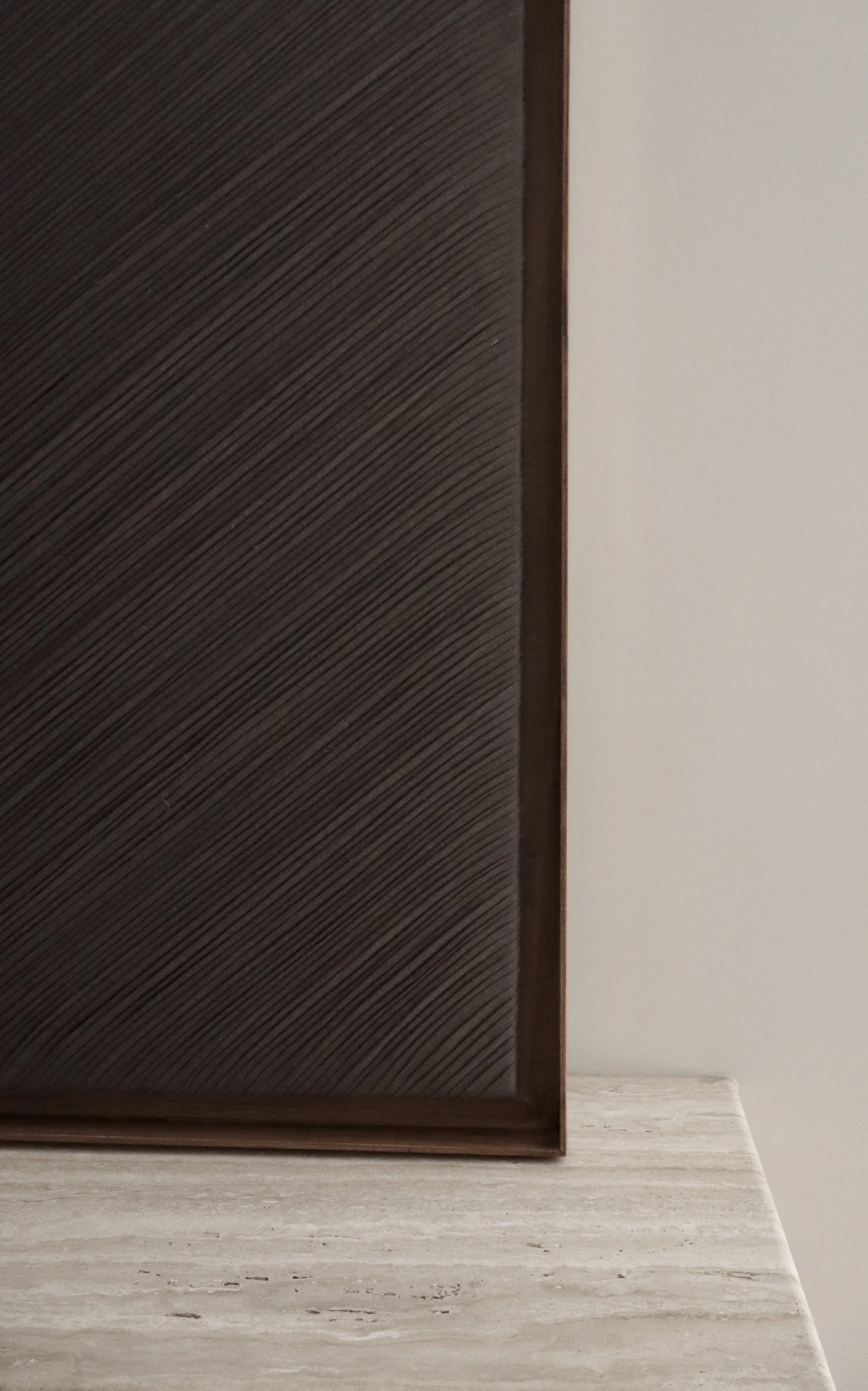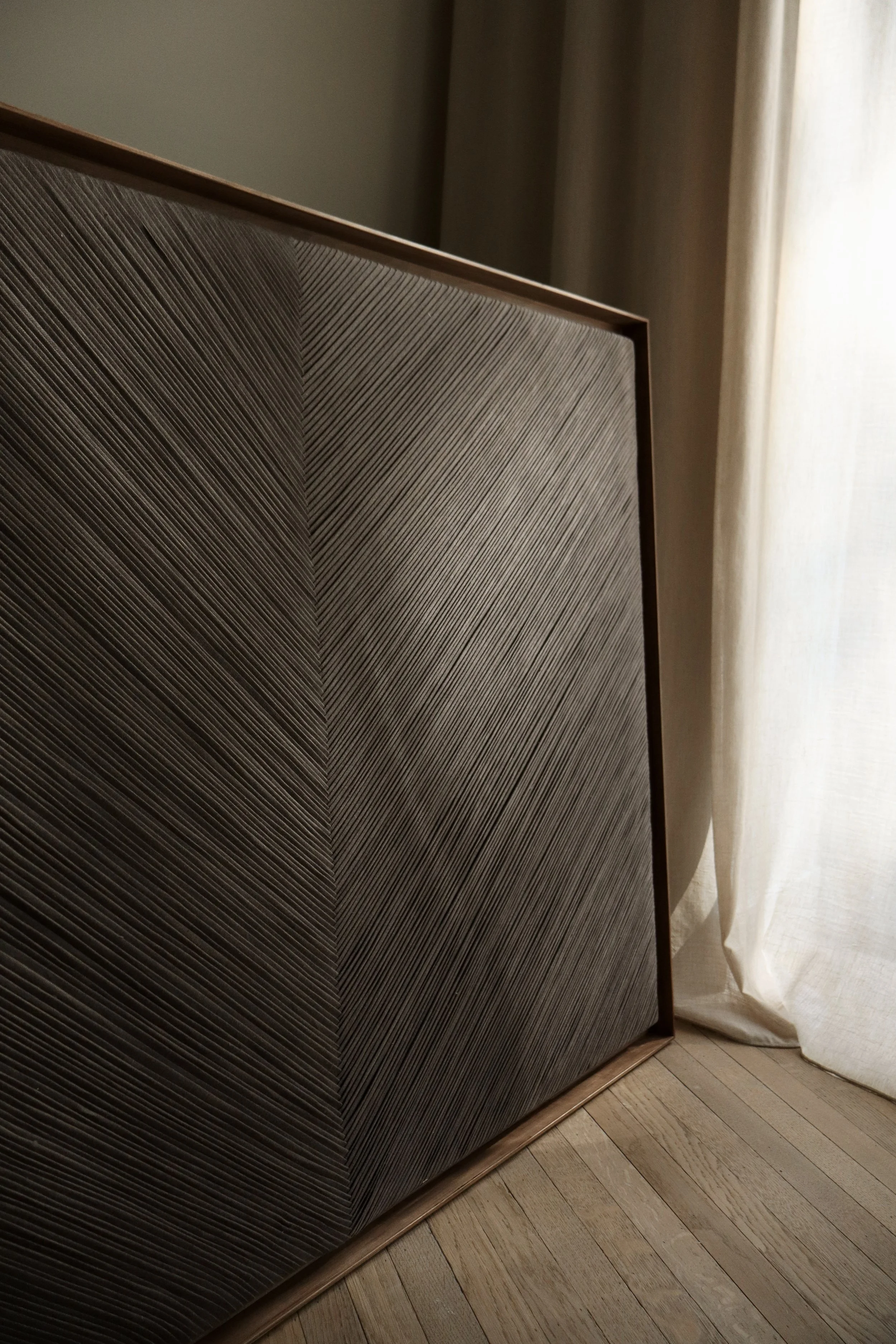 Crafted from a linen fabric, including a dark linden wood floating frame.